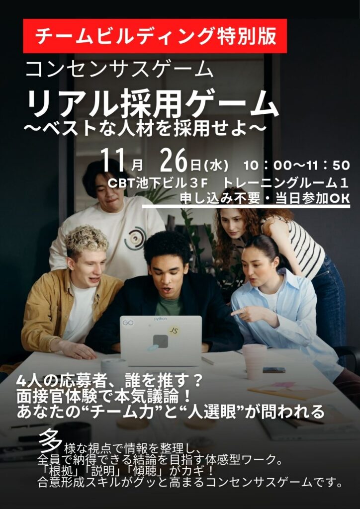 先日11月26日にチームビルディングの一環として「リアル採用ゲーム」を実施しました。みんなで面接官になりきって、4人の応募者の誰を採用するかを本気で考え、コンセンサスを得るワークです。